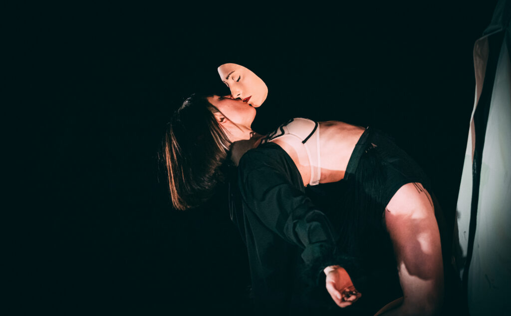 masks, we explore the deformation and disintegration of the corporeal and the mental, approached with a sharp and ironic acting